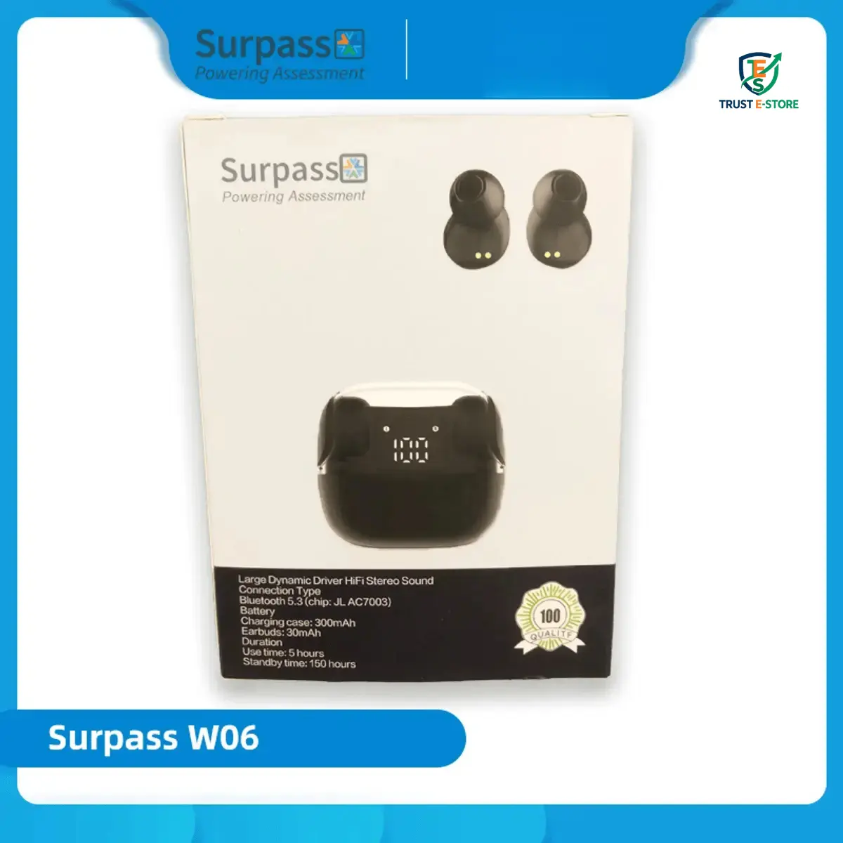 Experience powerful sound and lasting comfort with the Surpass W06 TWS Earbuds. Featuring large dynamic drivers for deep bass and stereo sound, this earbud ensures high-quality audio performance whether you’re listening to music or attending calls. The sleek charging case includes a digital display that shows battery status in real-time. With Bluetooth 5.0, seamless connection, and up to 150 hours standby time, it’s your perfect on-the-go audio companion.